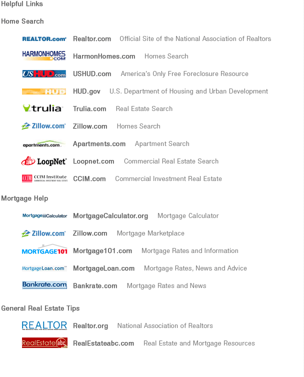 Realtor.com HarmonHomes.com USHUD.com HUD.gov Trulia.com Zillow.com Apartments.com MortgageCalculator.org Zillow.com Mortgage101.com MortgageLoan.com Bankrate.com Loopnet.com CCIM.com Realtor.org Realestateabc.com